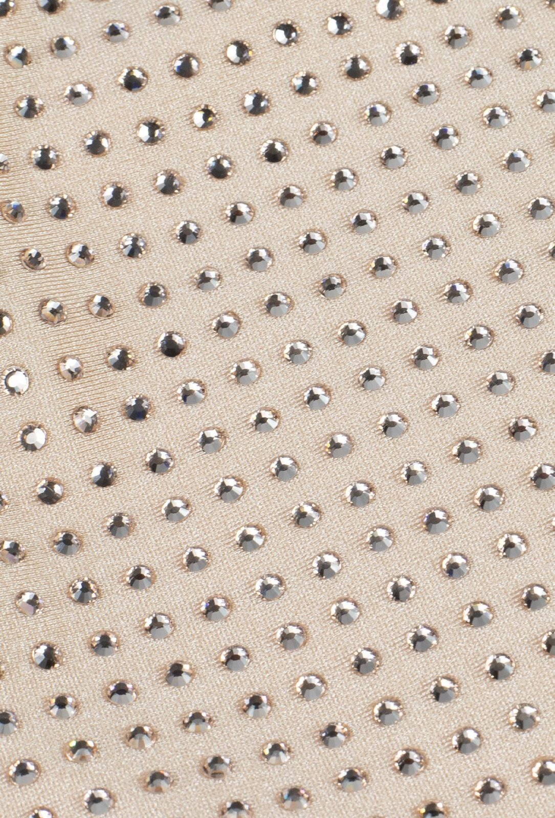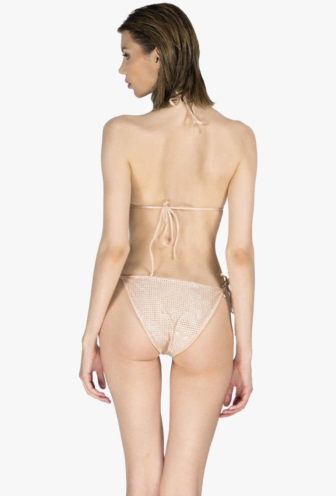 Add a touch of luxury and refinement to your summer wardrobe with this hand-embellished rhinestone champagne bikini.