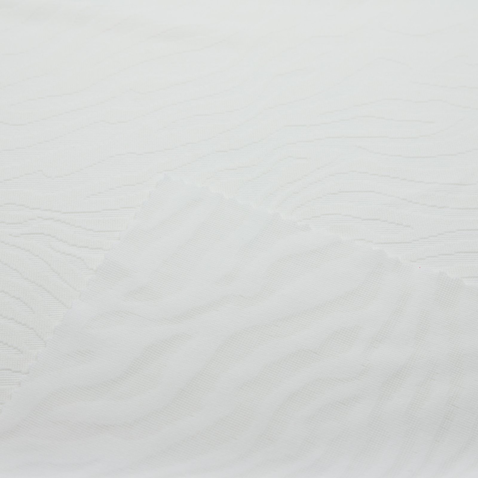 Tejido jacquard elástico grueso de textura blanca con estampado de cebra, relieve pronunciado y alto gramaje. Este tejido jacquard elástico grueso es ideal para trajes de baño estructurados, trajes de baño premium y piezas de moda que requieran sujeción y textura.