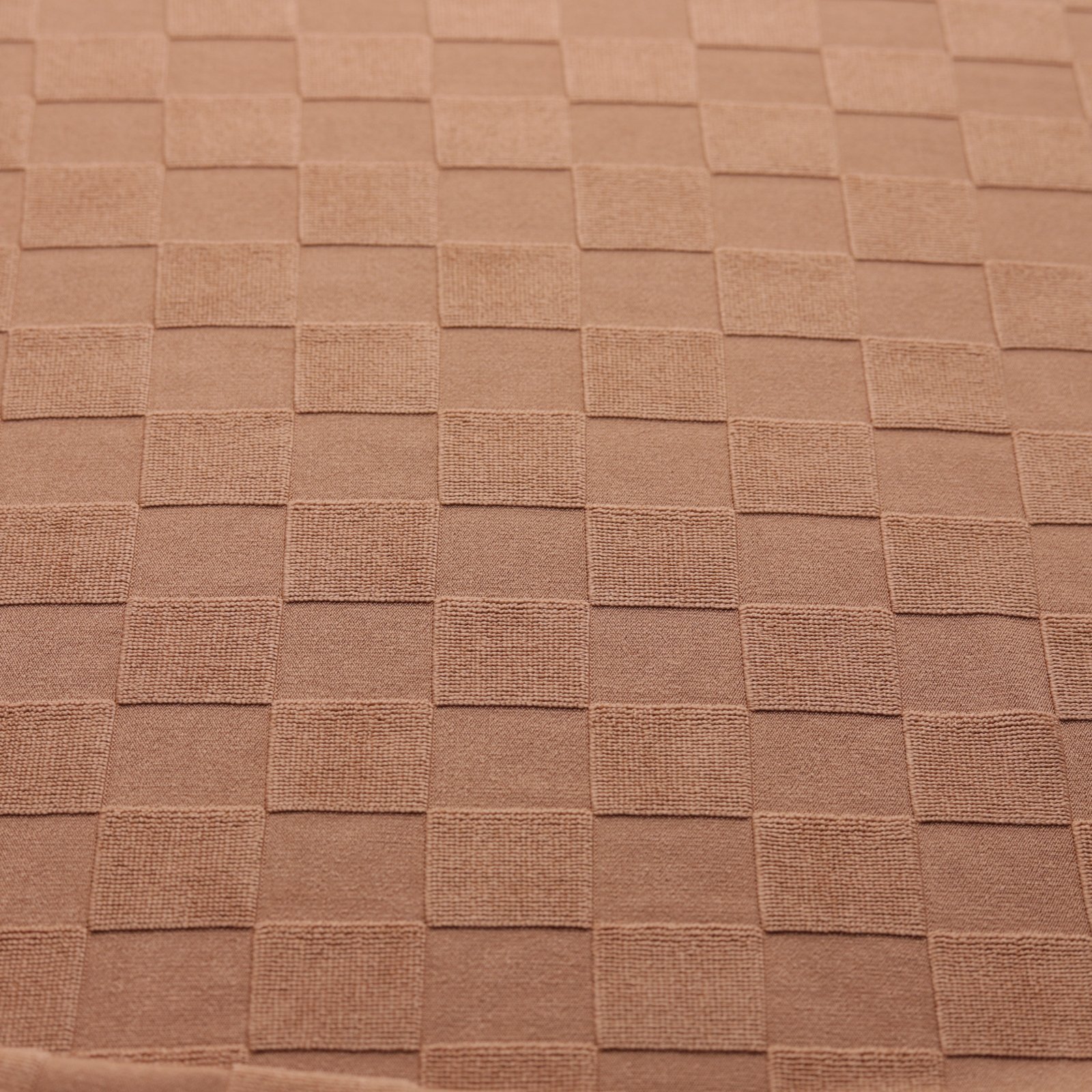 Tejido jacquard liso marrón y texturizado con pequeños cuadros. Este tejido de lycra elástica se vende sin pedido mínimo.