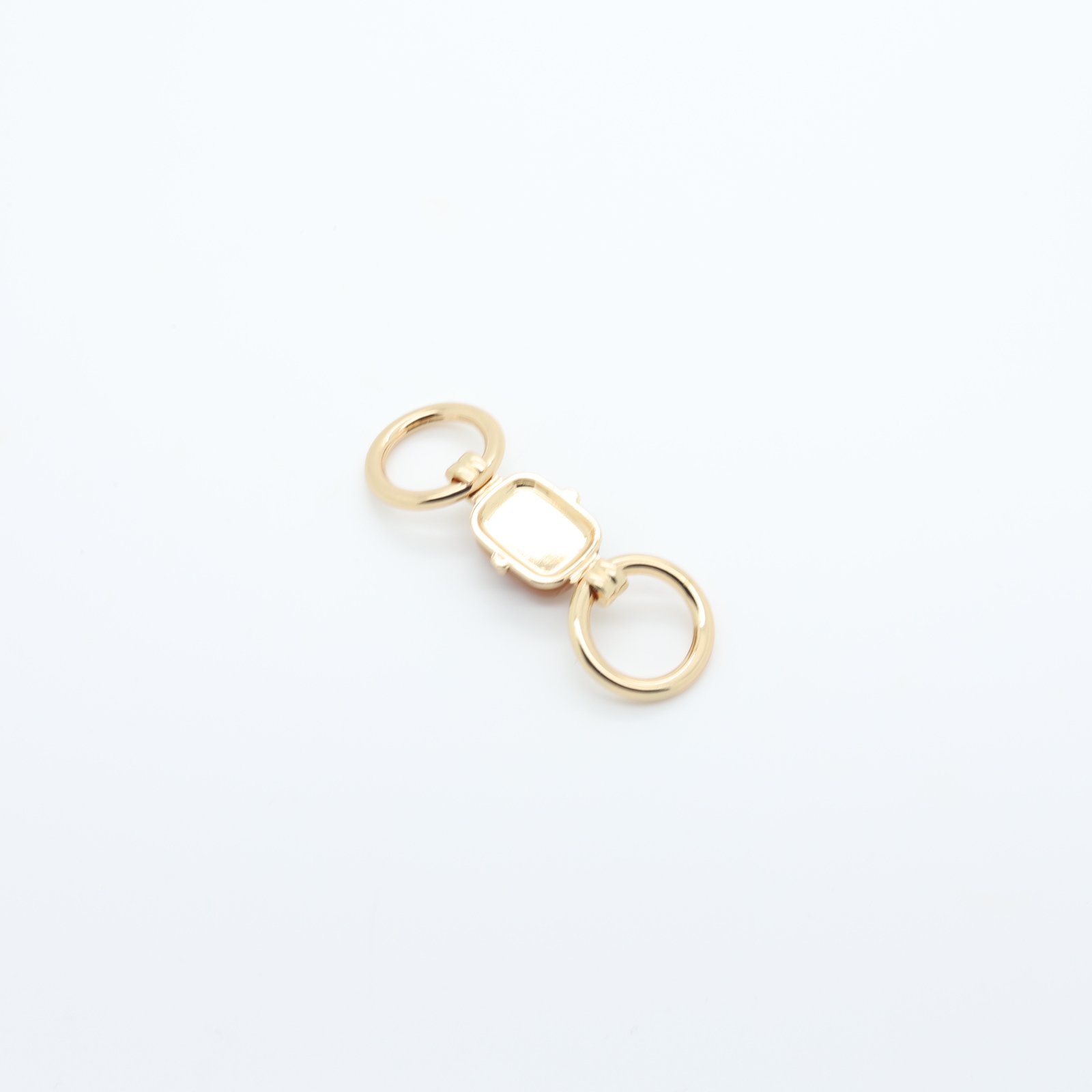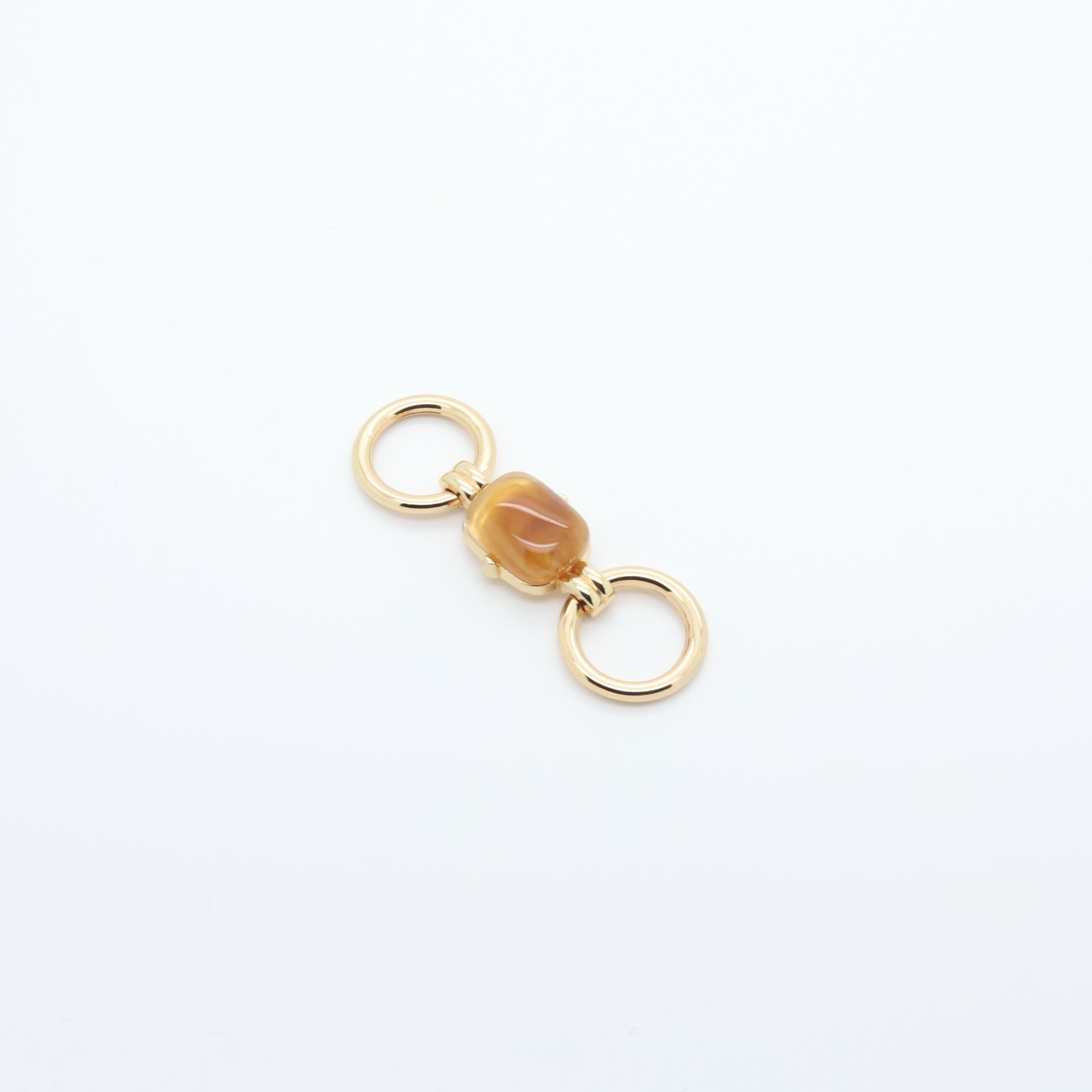 Questo connettore a due anelli in metallo placcato oro con pietra centrale color ambra è un elemento decorativo e funzionale per l'assemblaggio di tessuti. Aggiunge una finitura elegante e luminosa alle creazioni di costumi da bagno e abbigliamento.