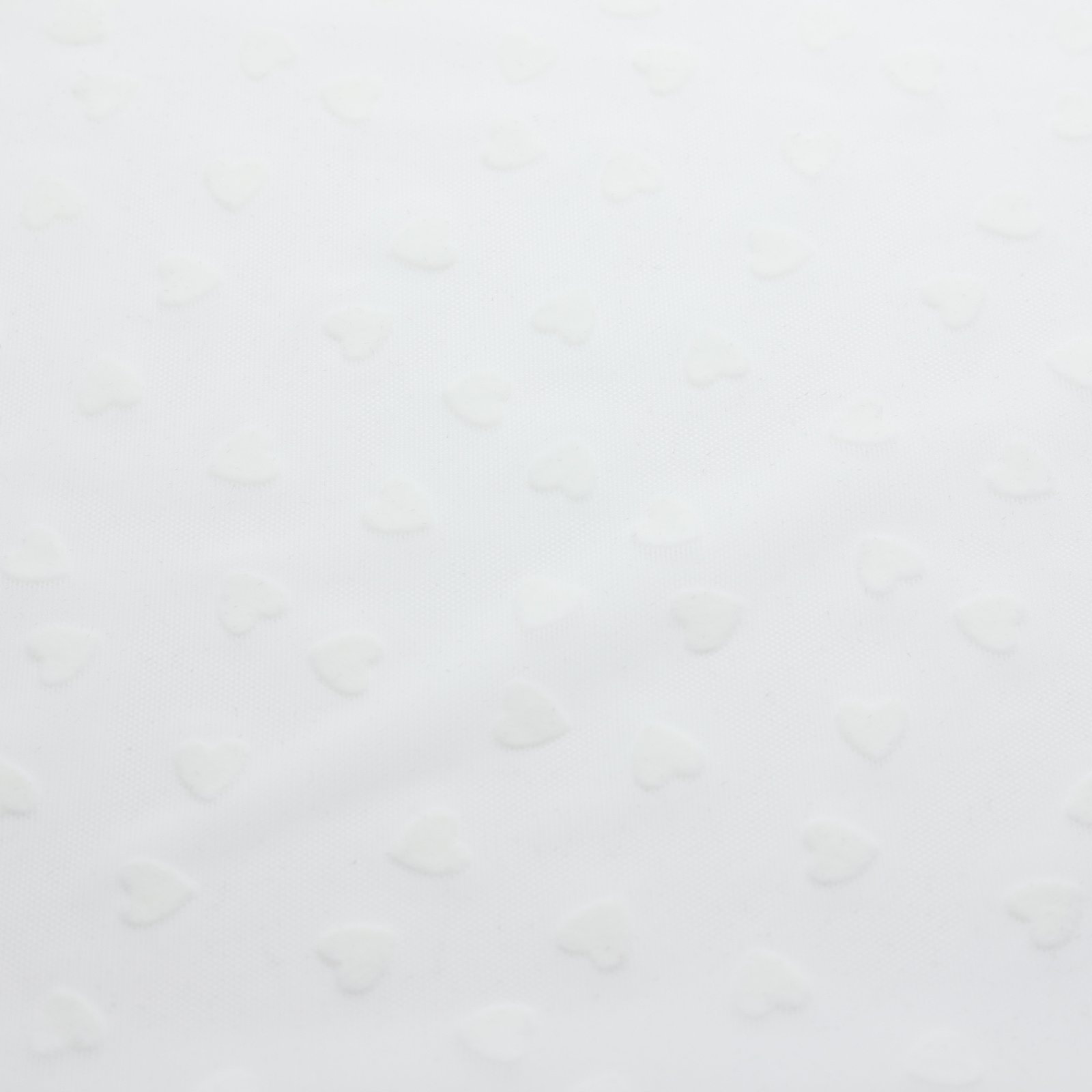 Tecido de rede elástica com flocagem de coração de veludo, certificado OEKO-TEX®. Leve e elástico, este tecido decorativo em rede é ideal para lingerie delicada, fatos de banho elegantes e criações requintadas que exigem transparência e conforto.