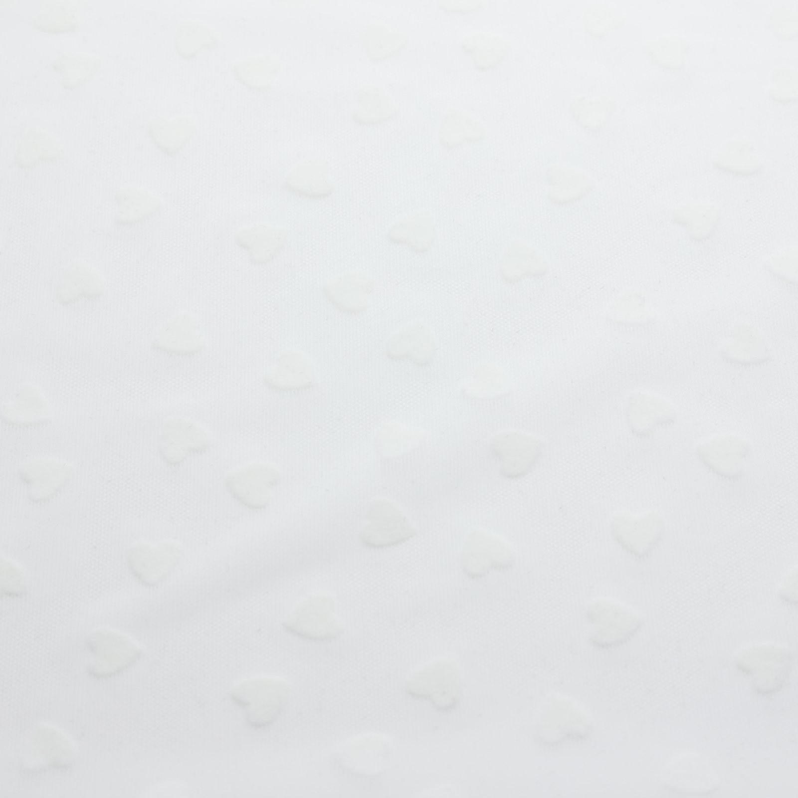 Tecido de rede elástica com flocagem de coração de veludo, certificado OEKO-TEX®. Leve e elástico, este tecido decorativo em rede é ideal para lingerie delicada, fatos de banho elegantes e criações requintadas que exigem transparência e conforto.