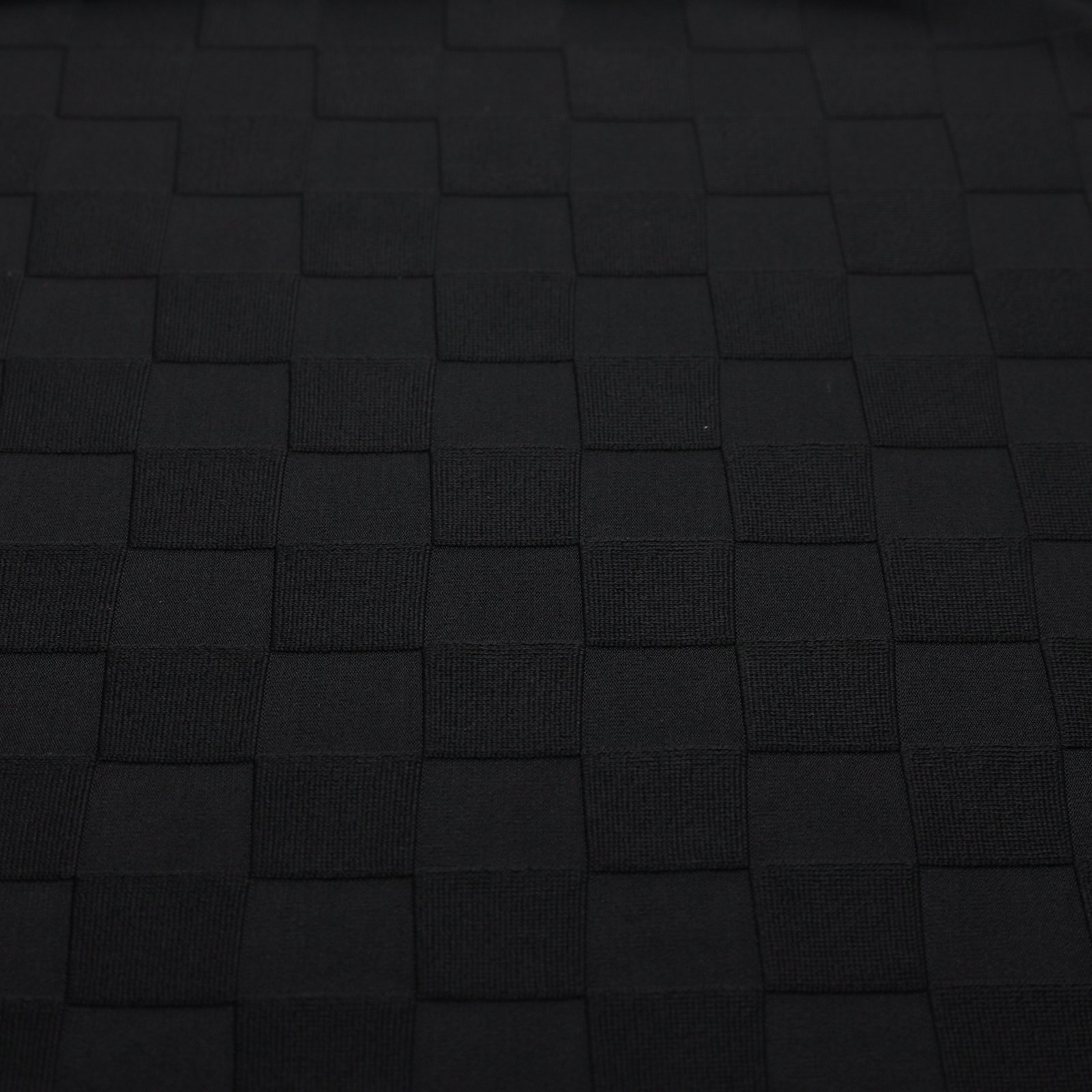Tecido jacquard preto liso texturado com pequenos xadrezes para fatos de banho, elástico e estruturado. Este tecido jacquard preto liso texturado é vendido sem um MOQ e é adequado para fatos de banho.