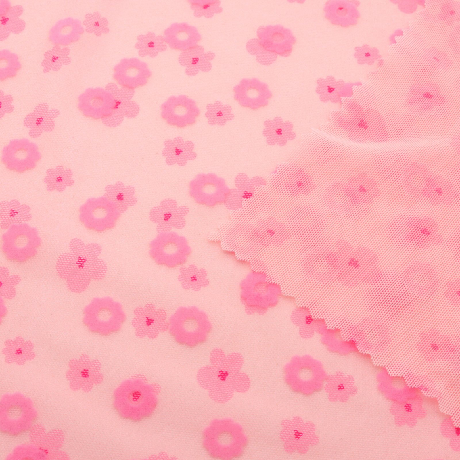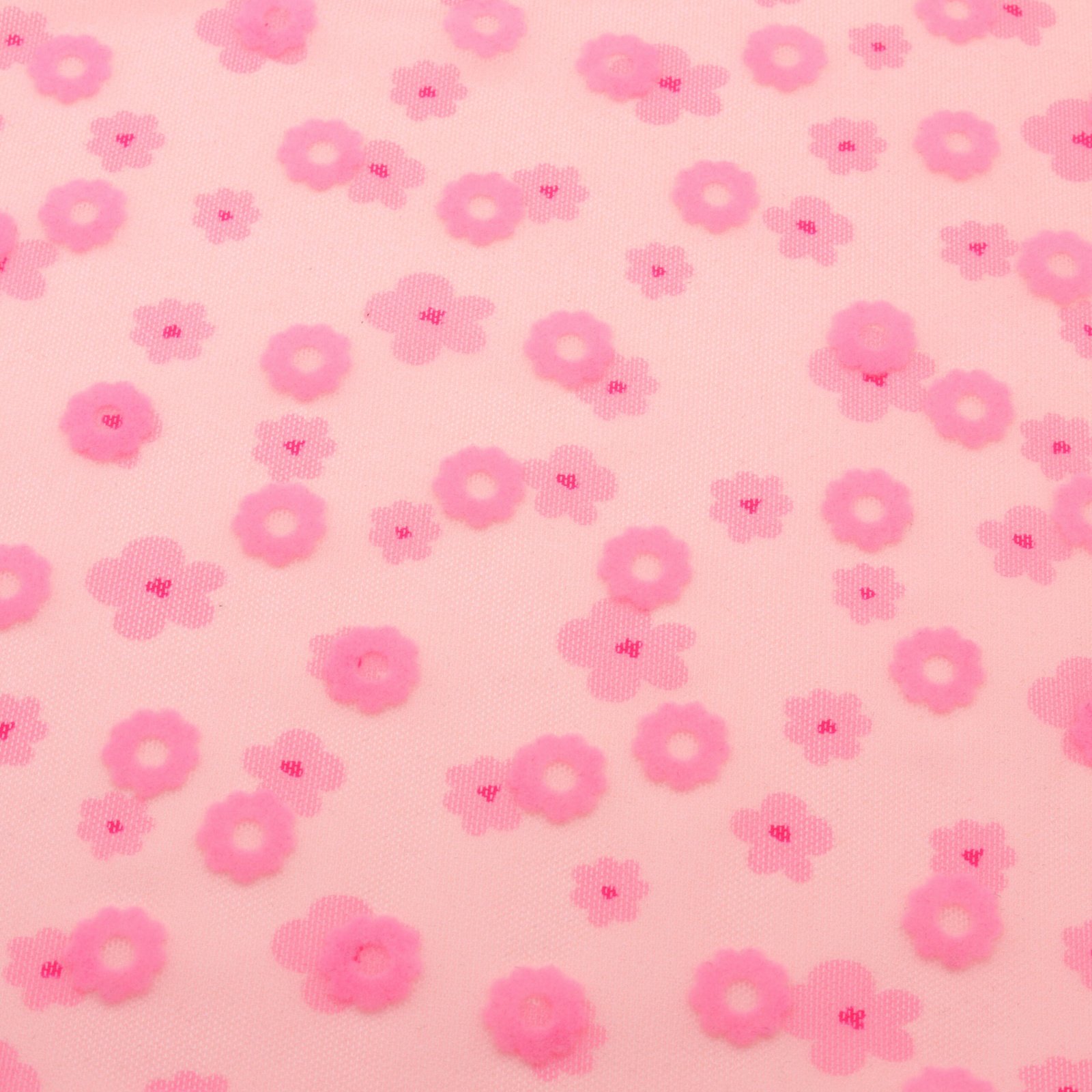 Aspect : Résille transparente ornée de motifs floraux floqués roses