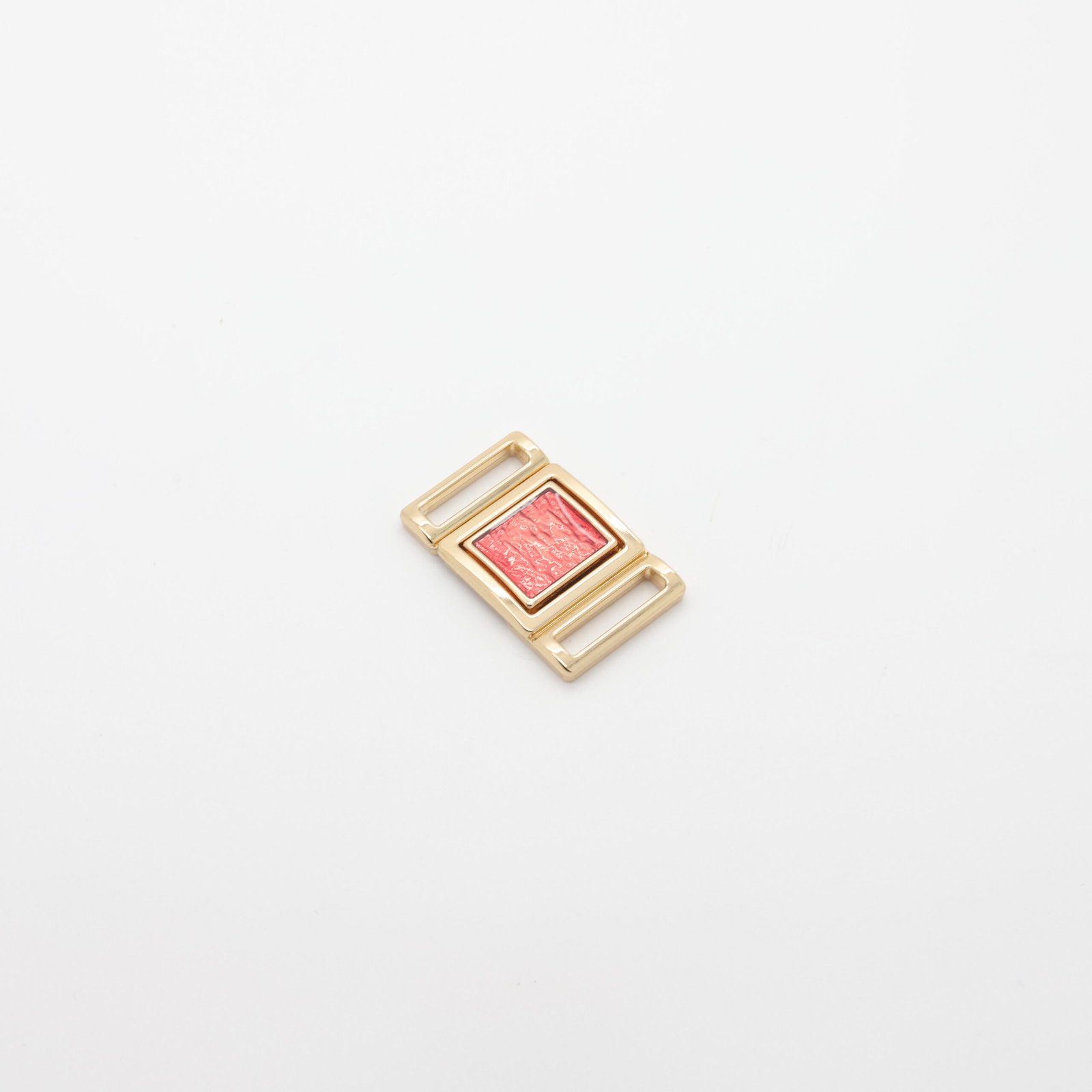 Fermoir rectangulaire en métal doré, doté d’un insert central coloré texturé, est conçu pour la confection de maillots de bain et bikinis haut de gamme.