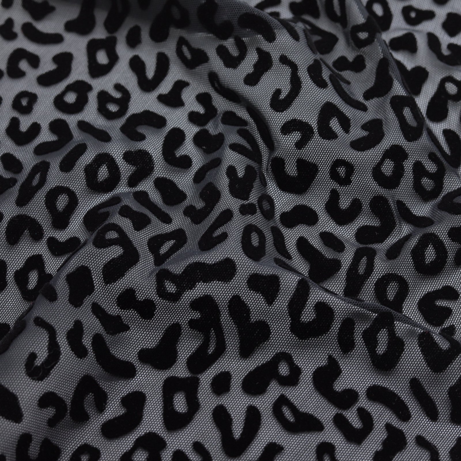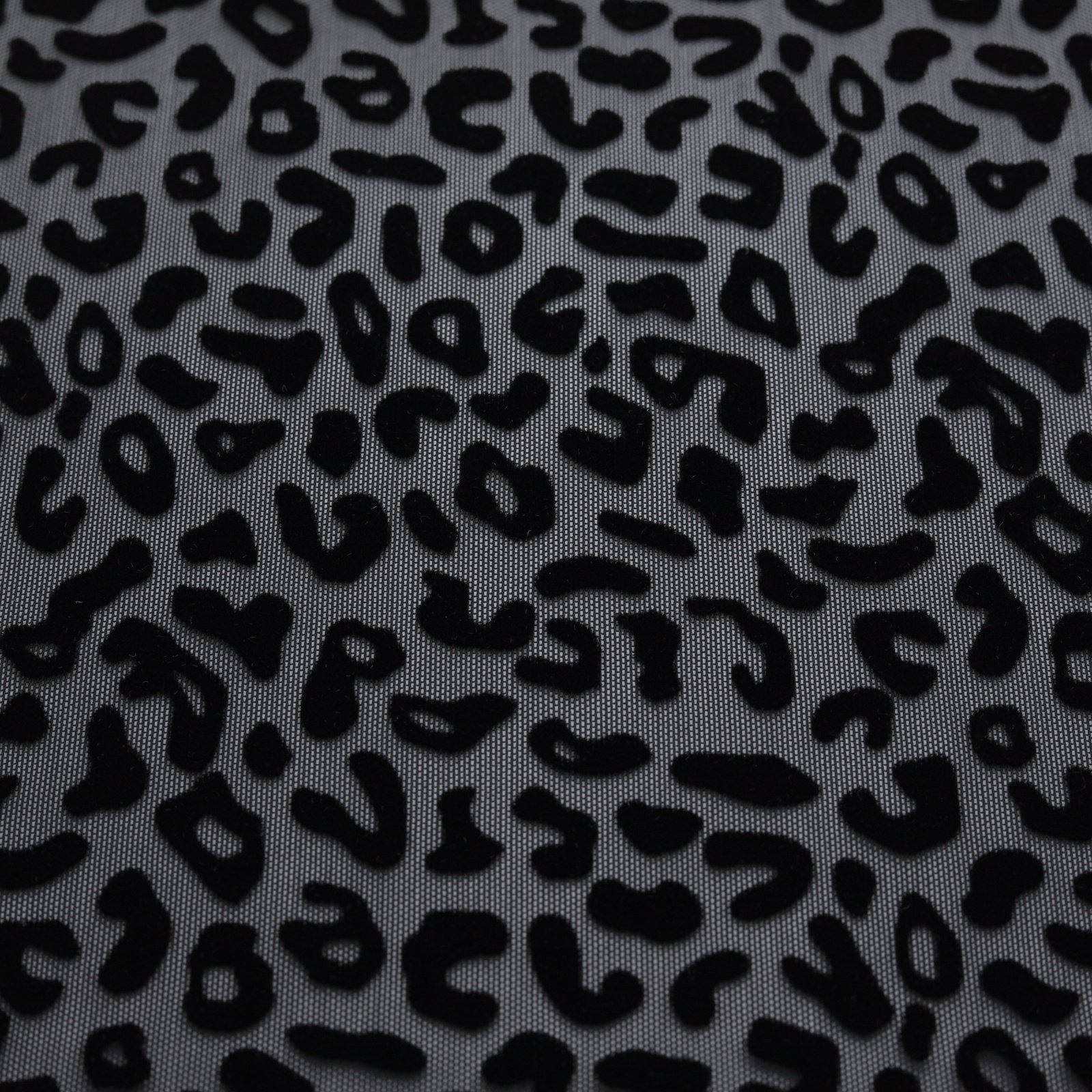 Résille extensible noire avec flocage léopard velours, légère et décorative, certifiée OEKO-TEX®. Cette résille fine et extensible offre un contraste élégant entre transparence et motif velours, idéale pour la confection de lingerie créative, détails mode et pièces audacieuses à forte identité visuelle.