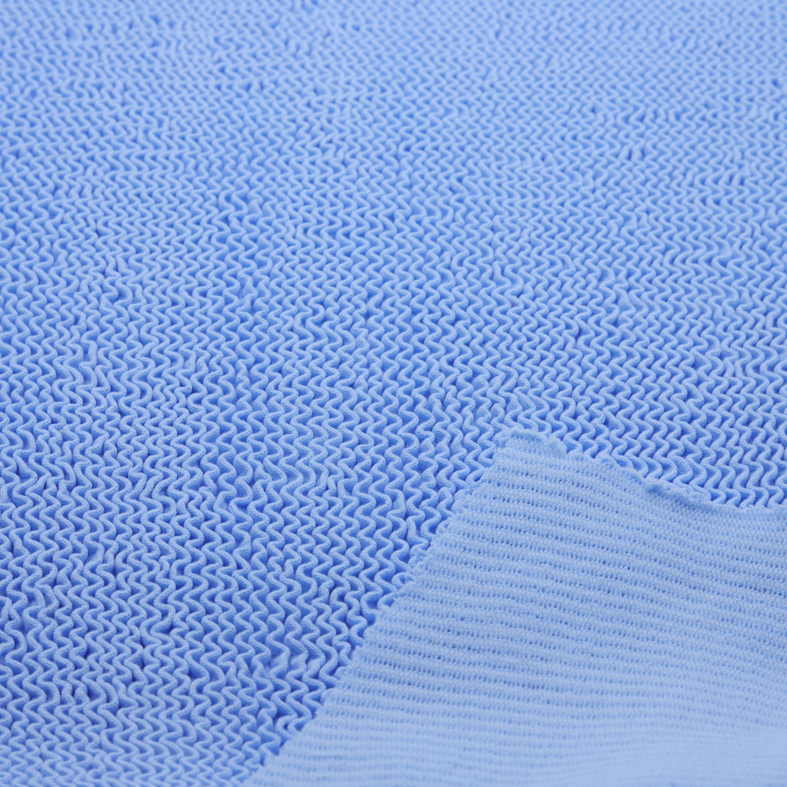 Tissu en éponge épais en relief bleu, extensible et technique. Ce tissu éponge épais en relief est idéal pour les créations de maillots de bain, vêtements de plage et pièces confort, avec une texture structurée et un fort grammage.