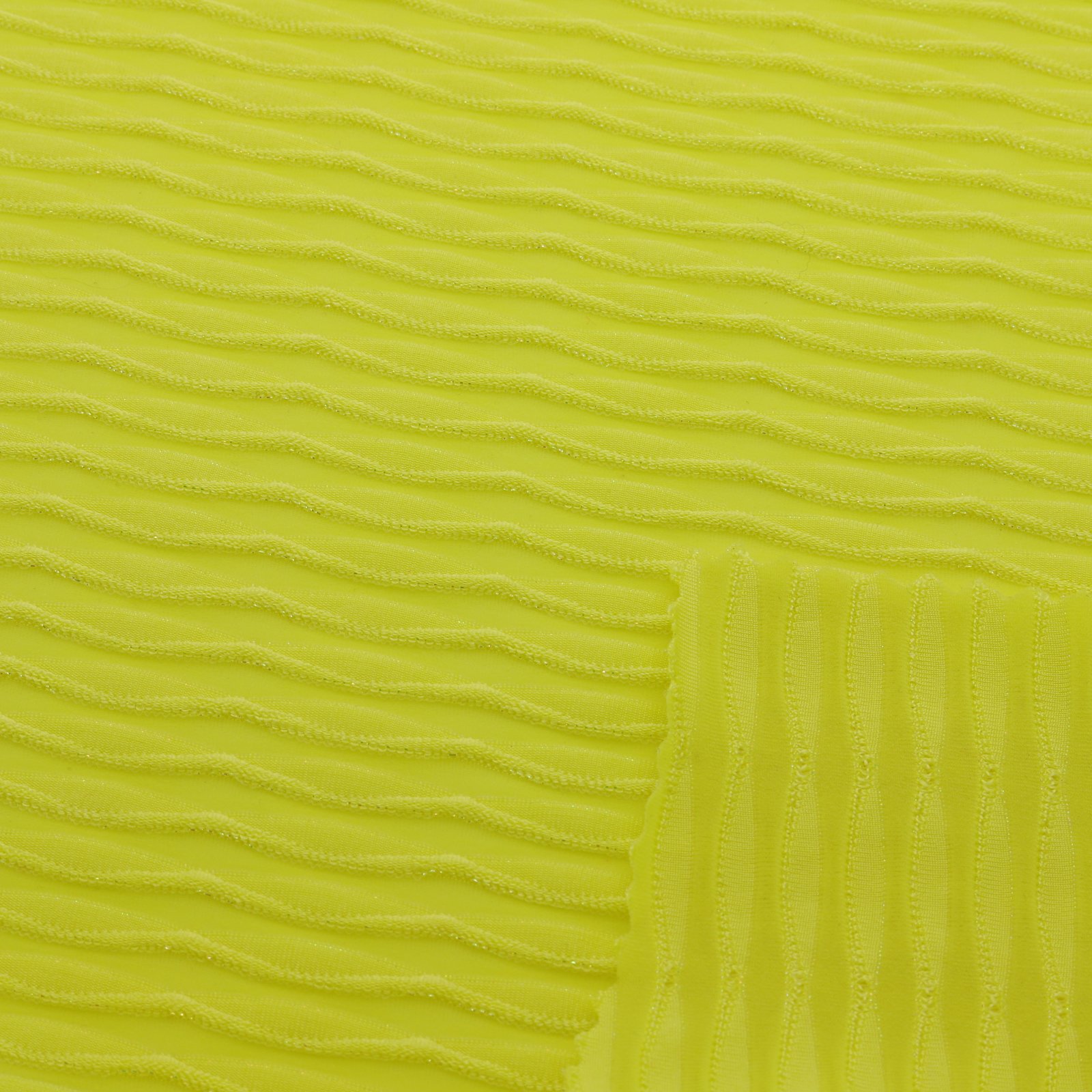 Tissu jacquard jaune texturé extensible. Ce jacquard léger à relief ondulé offre une surface dynamique et moderne, avec une bonne élasticité et un tombé fluide. Idéal pour la confection de maillots de bain créatifs, de lingerie mode et de pièces estivales au design original.