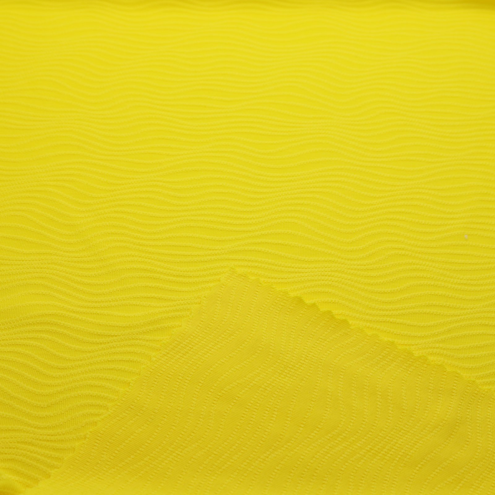 Tissu maille jacquard à rayures ondulées jaunes, à relief régulier et aspect structuré. Ce tissu maille jacquard présente une texture visuelle marquée et une élasticité visible à l’image.